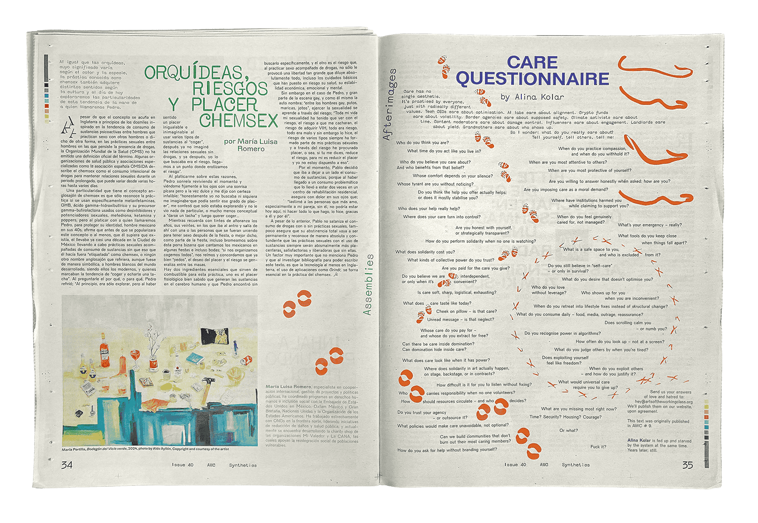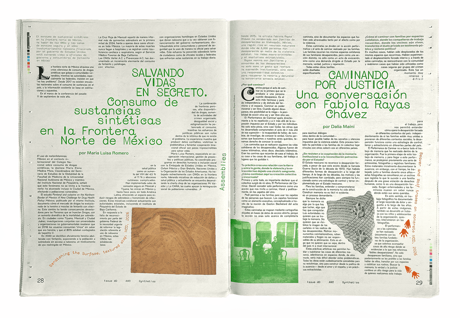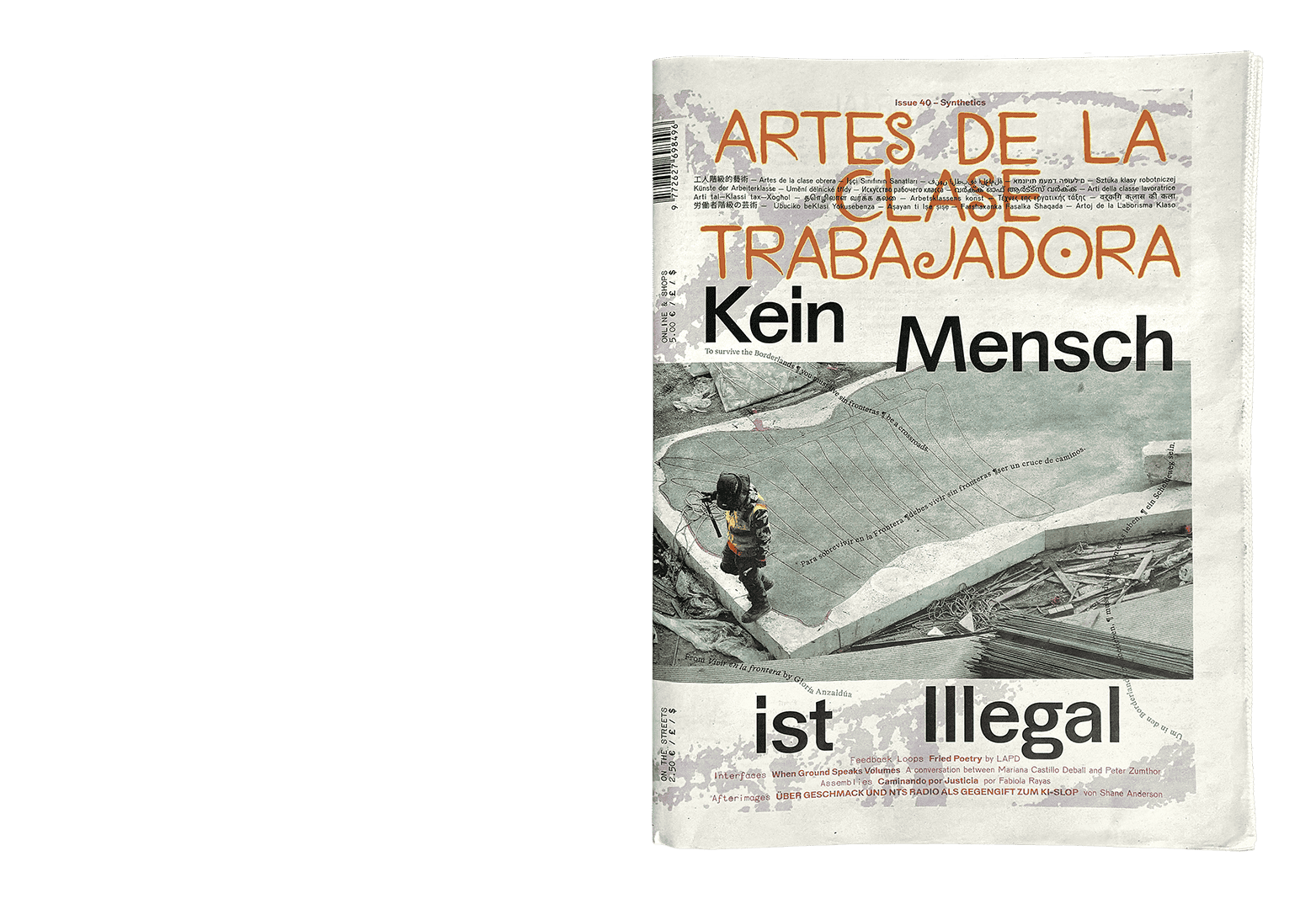 “Synthetics” looks at society’s toxins, addictions, and collective hallucinations—everything that threatens to erase imagination and replace it with disillusionment. Across this issue, our contributors write with embodied experience and critical analysis, as they reflect on Elie Wiesel’s famous quip KEIN MENSCH IST ILLEGAL (nobody is illegal) on our cover.